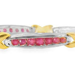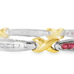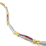 Estate 14K White and Yellow Gold Tennis Bracelet featuring Rubies and Diamonds. This exquisite piece showcases 28 natural round rubies, each measuring 2mm in diameter, alternating with 21 brilliant round diamonds that total 0.12 carats. The combination of rich red rubies and sparkling diamonds set in a mix of white and yellow gold creates a timeless and luxurious design. The bracelet measures 7 and 3/16 inches long by 3/16 of an inch wide, and it weighs 11.7 grams.