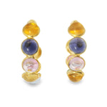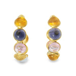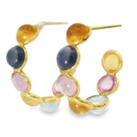 Stunning estate 18K yellow gold gemstone hoop earrings. Each unique piece features 3 cabochom citrines, 2 cabochon topaz and 2 cabochon rose quartz. All gemstones are natural. Each earring is...