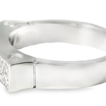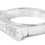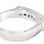 The top of the ring measures 3/16 inch wide by 13/16 inch long, providing a sophisticated design that is bold yet comfortable to wear. Weighing 5.8 grams, this 18K white gold ring exudes luxury and craftsmanship. Designed in size 6.75, the ring is also available for sizing to ensure a perfect fit. This estate piece is a wonderful addition to any fine jewelry collection, perfect for marking a special occasion or as an elegant everyday piece.