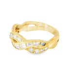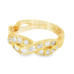 Gorgeous Estate 18K Yellow Gold Baguette Diamond Twisted Wedding Band Ring – This elegant and timeless 18K yellow gold wedding band is a perfect choice for those seeking a blend of classic design and modern sophistication. Featuring a combination of brilliant round diamonds and elegant baguette diamonds, the twisted design adds a touch of romantic flair to this stunning piece. The total diamond weight of 1.25 carats ensures this ring sparkles with brilliance and luxury.