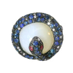 Unique 14K White Gold Chalcedony Quartz Sapphire Ruby Diamond Snake Ring. This color-stone ring features one large polished chalcedony quartz in the center measuring about 14mm in diameter, surrounded by sapphires, rubies and diamonds. The top of the ring measures 3/4 of an inch across. Total diamond weight is 0.36 of a carat. The ring weighs 6 grams. It is a size 6.5. Sizing is available for an additional fee.