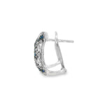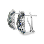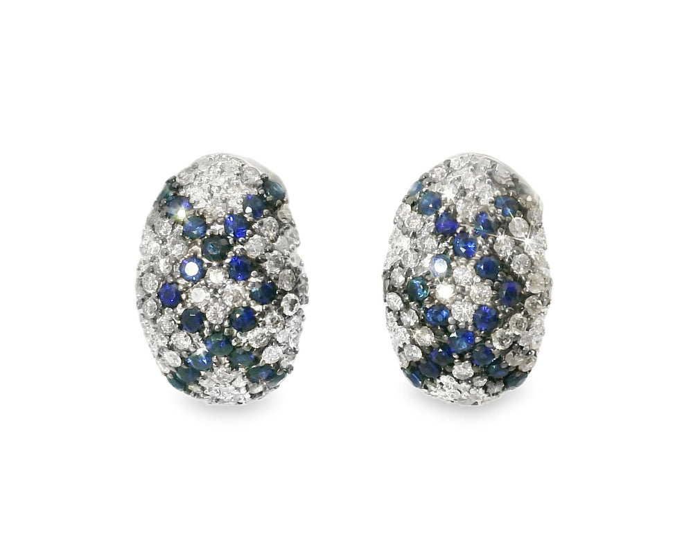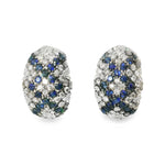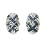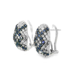 Unique 14K White Gold Champagne Diamond Sapphire Mosaic Huggie Earrings. This pair features numerous natural round sapphires, totaling .99 carats and numerous brilliant round champagne and white diamonds, totaling 1.09 carats. Each earring measures 3/4 of an inch long by .5 of an inch wide. The pair weighs 7.4 grams.