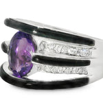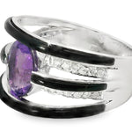 This stunning 14K white gold band ring is a true statement piece, featuring a vibrant natural oval amethyst at its center, framed by 24 brilliant round diamonds and custom-cut black onyx inlays. The deep purple hue of the amethyst, combined with the striking contrast of black onyx and shimmering white diamonds, creates a bold yet elegant design that stands out effortlessly.