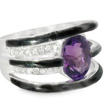 This stunning 14K white gold band ring is a true statement piece, featuring a vibrant natural oval amethyst at its center, framed by 24 brilliant round diamonds and custom-cut black...
