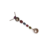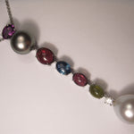 Unique 18K White Gold Diamond Gemstone Tahitian Pearl Pendant Necklace. From top to bottom this beautiful piece features a natural oval cut amethyst measuring 7mm by 8mm, a dark Tahitian pearl measuring half of inch in diameter, a cabochon garnet, blue topaz, amethyst, and peridot in descending size, one brilliant round diamond weighing 0.19 carats and one more natural pearl at the bottom measuring 9/16 of an inch in diameter. The necklace portion is almost 16 inches long with the pendant dropping down about 3 inches. The piece weighs 16.4 grams.
