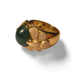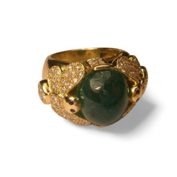 Gorgeous 18K Yellow Gold Cabochon Emerald Diamond Dragonfly Designer Ring. This stunning piece features one natural oval cabochon emerald weighing 5 carats and numerous brilliant round diamonds, totaling .70 carats....