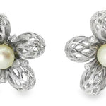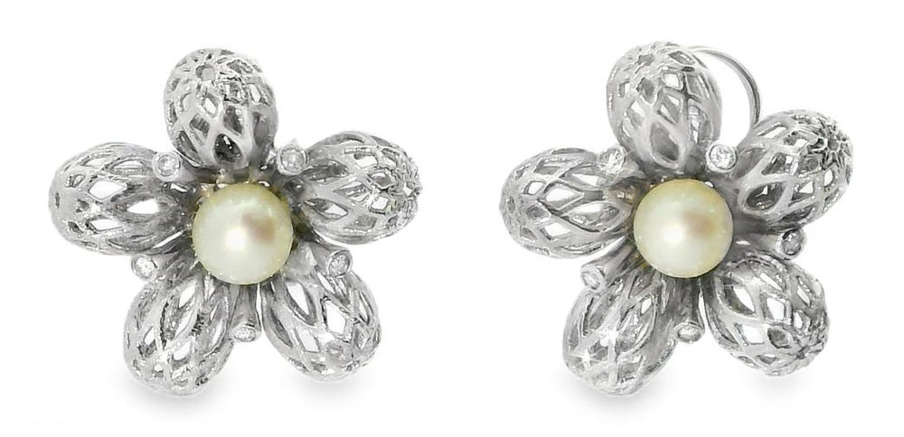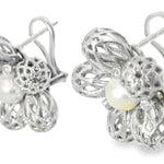 14K White Gold Earrings with Diamonds. Each earring features 5 brilliant round diamonds delicately set in the center of an intricate white gold lace flower design. At the heart of each flower is a lustrous 8mm white pearl, adding a sophisticated and timeless elegance. The earrings measure 15/16 inch across and weigh 11.6 grams, making them the perfect balance of refined beauty and wearable luxury.