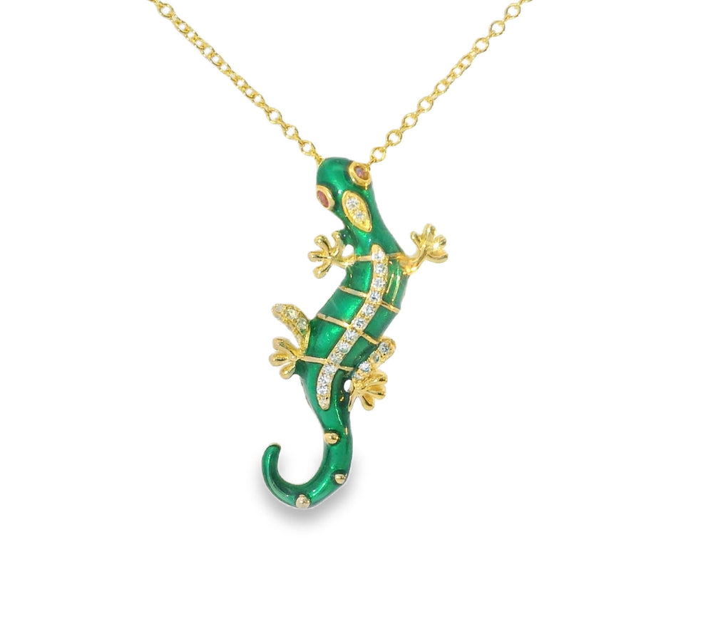 This stunning gold lizard pendant captures the essence of nature with its intricate design. Crafted with precision, it showcases a delicate balance of elegance and whimsy, making it a perfect...