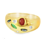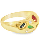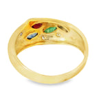 14K Yellow Gold Gemstone and Diamond Ring. This stunning piece showcases a vibrant array of natural gemstones, including ruby, emerald, and sapphire, accented by four brilliant round diamonds. The colorful arrangement and elegant design make this ring a timeless and sophisticated addition to any jewelry collection.