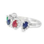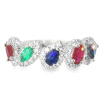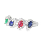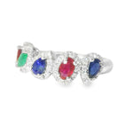 Gorgeous 18K White Gold Ruby Sapphire Emerald Diamond Band Ring. This great item features 2 pear shaped sapphires, 2 oval rubies and one marquise emerald, totaling 1.22 carats. There are...