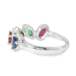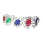 Gorgeous 18K White Gold Ruby Sapphire Emerald Diamond Band Ring. This great item features 2 pear shaped sapphires, 2 oval rubies and one marquise emerald, totaling 1.22 carats. There are numerous brilliant round diamonds, totaling .38 carats. All gemstones are natural. The band measures .25 of an inch wide. It is a size 6.75. Sizing is available for an additional charge. The ring weighs 5.4 grams.