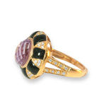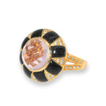 This gorgeous 14K pink gold amethyst cocktail ring is a stunning statement piece that combines vibrant color and sparkling diamonds. The ring features 1 natural round amethyst, measuring 11 mm in diameter, set on a black onyx base. The amethyst is beautifully surrounded by numerous brilliant round diamonds, adding extra brilliance and elegance. The total diamond weight is 0.22 carats, enhancing the overall design.