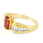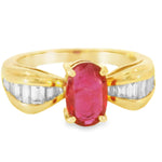 This exquisite 14K Yellow Gold Ruby and Diamond Ring is the perfect blend of luxury and elegance. Designed to make a statement, this stunning piece showcases a vibrant, natural oval ruby and sparkling diamonds that together create an unforgettable accessory.