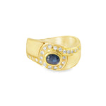 • 18K yellow gold ring band with oval blue sapphire, diamonds, and mother of pearl