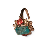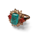 Magnificent 18K White Gold Emerald Tourmaline Diamond Designer Ring. This great piece features one natural emerald weighing 7 carats, and 14 brilliant round diamonds, totaling .96 carats. It also features 2 heart shaped natural pink tourmalines. The top of the ring measures 3/4 of an inch long by 3/4 of an inch wide. It is a size 7. Sizing is available. It weighs 7.5 grams.