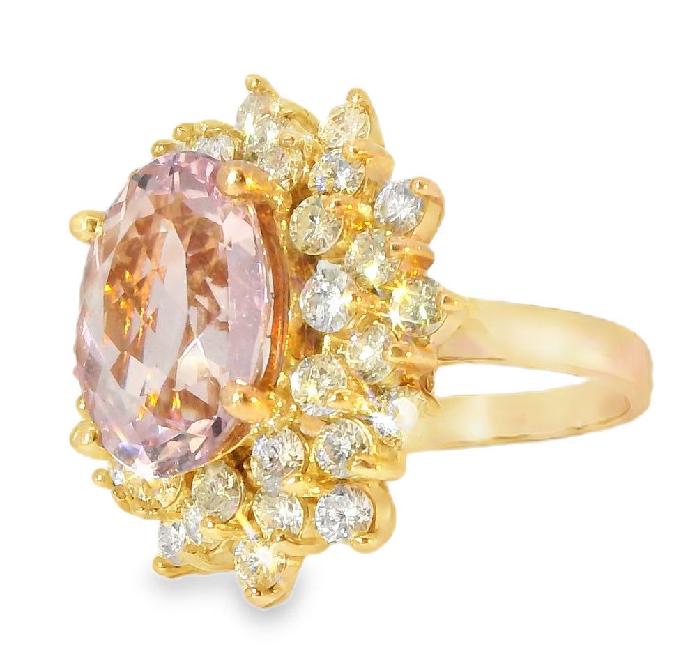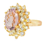 This breathtaking 14K rose gold cocktail ring showcases a stunning oval natural morganite, weighing nearly 5 carats, surrounded by 36 superior-quality brilliant round diamonds, totaling 2.15 carats. The warm hues...