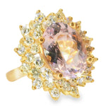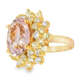 This breathtaking 14K rose gold cocktail ring showcases a stunning oval natural morganite, weighing nearly 5 carats, surrounded by 36 superior-quality brilliant round diamonds, totaling 2.15 carats. The warm hues of blush pink morganite and romantic rose gold create a luxurious and feminine appeal, making this ring a true statement piece. Ideal for special occasions or as an elegant everyday accessory, this ring exudes timeless sophistication.