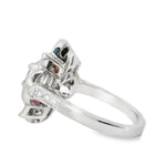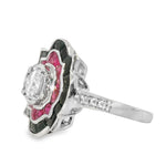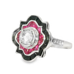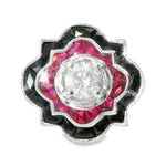 Magnificent Handmade Art Deco 18K White Gold Hand Cut Onyx Ruby Diamond Engagement Ring. This gorgeous ring features 1 brilliant round diamond, weighing .68 carats, natural hand cut rubies, totaling...