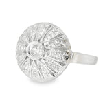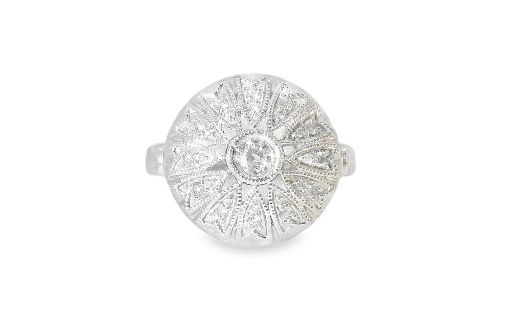 This exquisite antique ring is a timeless treasure, showcasing the brilliance of numerous round diamonds set in 14K white gold. A perfect choice for vintage jewelry lovers or those looking for a unique statement piece.