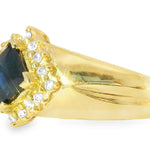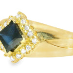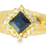 14K Yellow Gold Band Ring with Sapphire and Diamonds. This exquisite piece features a natural square-shaped sapphire, measuring 5 mm by 5 mm, surrounded by 16 brilliant round diamonds. The...