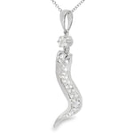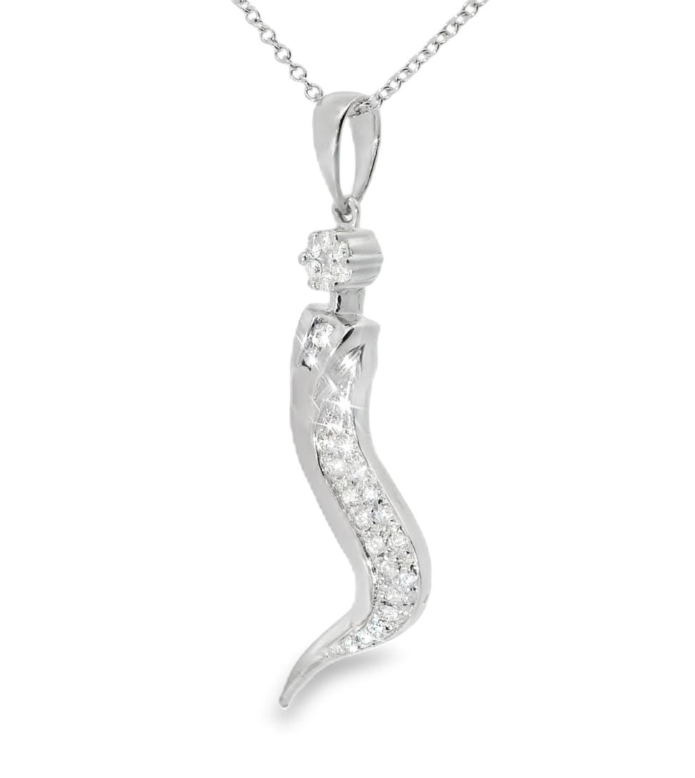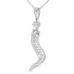 Add a touch of elegance and charm to your jewelry collection with this 14K White Gold Diamond Italian Pepper Pendant. Featuring 29 brilliant round diamonds, each measuring 1 mm, the total diamond weight is 0.25 carats. The pendant’s sleek design is inspired by the traditional Italian pepper shape, making it a unique and sophisticated piece that will enhance any look.