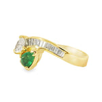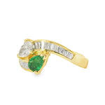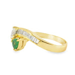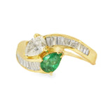 Discover the allure of this stunning gold ring featuring a vibrant tear shaped emerald and numerous diamonds. The intricate design showcases a perfect blend of elegance and sophistication, making it an ideal accessory for any occasion. Whether you're dressing up for a special event or adding a touch of glamour to your everyday look, this ring is sure to turn heads.