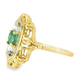 Antique Estate 14K Yellow Gold Emerald Diamond Filigree Ring. This great piece features one natural oval emerald and 2 brilliant round diamonds. The ring is a size 6.75. It weighs 2 grams.