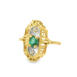 Antique Estate 14K Yellow Gold Emerald Diamond Filigree Ring. This great piece features one natural oval emerald and 2 brilliant round diamonds. The ring is a size 6.75. It weighs...
