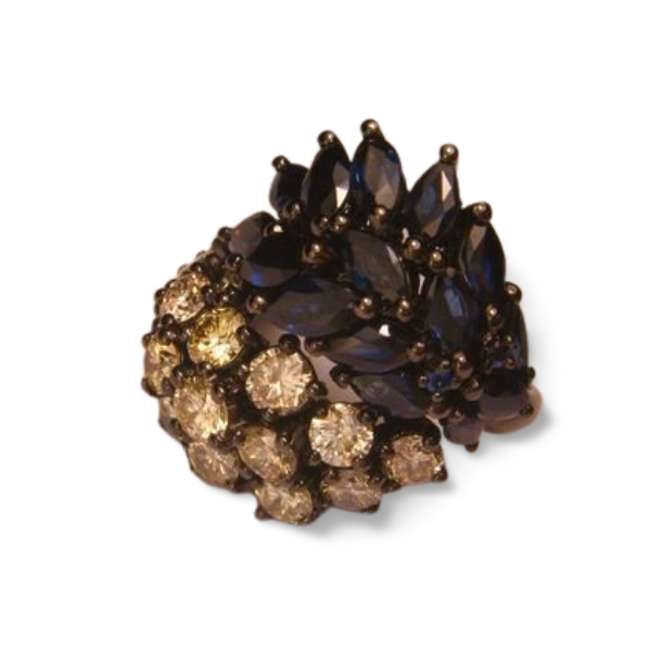 This 18K White Blackened Gold Champagne Diamond Sapphire Wide Band Ring is a masterpiece that combines vintage charm with modern luxury. With its stunning diamonds and sapphires, it offers a rich, multi-dimensional look that will elevate any ensemble. The wide band design is not only a bold style statement but also a versatile piece that can be worn for both formal events and everyday elegance. If you are looking for a ring that embodies sophistication, uniqueness, and extraordinary craftsmanship, this is the perfect choice.