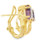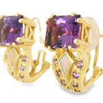 Gorgeous 14K Yellow Gold Inlaid Mother of Pearl and Amethyst Earrings. Each earring features a stunning square amethyst, measuring 10mm by 7mm, surrounded by 8 smaller round amethysts, each about 1mm in diameter. The rich purple hue of the amethysts contrasts beautifully with the iridescent mother of pearl inlay, creating a sophisticated and eye-catching design. Each earring measures 11/16 inch long by 3/8 inch at its widest point, and the pair weighs 6.2 grams.