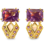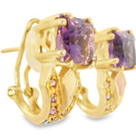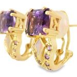 Gorgeous 14K Yellow Gold Inlaid Mother of Pearl and Amethyst Earrings. Each earring features a stunning square amethyst, measuring 10mm by 7mm, surrounded by 8 smaller round amethysts, each about...