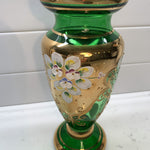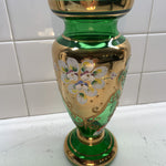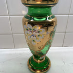 Czech Bohemian Egermann 24K Gold Encrusted Enameled Green Art Glass Vase. This stunning piece showcases the exquisite craftsmanship and elegance of Egermann glasswork. The rich green base is adorned with intricate 24K gold encrusting and hand-painted enameled floral details, making it a luxurious addition to any collection or decor.