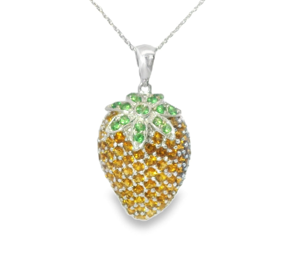 This charming 14K White Gold Orange Citrine and Tsavorite Strawberry Necklace/Pendant is a delightful blend of vibrant gemstones and intricate design. The pendant showcases numerous round citrines and tsavorites, with a total gemstone weight of 3.34 carats. The combination of the warm orange hues of the citrines and the rich green tsavorites creates a playful yet sophisticated look.