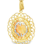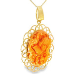 This exquisite 14K yellow gold filigree pendant features a genuine oval-shaped coral center, intricately designed with an angel and floral motif. Perfect for adding elegance and charm to any jewelry collection, this pendant is not only a statement piece but also a work of art, crafted to capture timeless beauty.