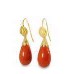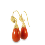 These Antique Estate 18K Gold Carved Cameo Red Coral Undyed Drop Dangle Earrings are a stunning display of natural beauty and craftsmanship. The earrings feature two large, natural red undyed corals, each carefully carved and set in a refined 18K gold frame. The vivid red coral adds a bold statement, and the intricate design brings out the rich, timeless elegance of the piece.