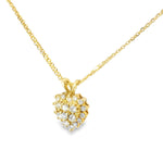 14K yellow gold diamond heart pendant. This unique piece features 21 brilliant round diamonds measuring about 2.5 mm in diameter each. The diamonds are D color and VS clarity. The total weight of the diamonds is a bit over 1 carat. The pendant measures 3/4 of an inch long by 1/2 of an inch wide. It weighs 2.7 grams. The chain is not included.