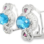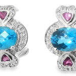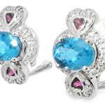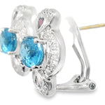 This charming pair of estate 14K white gold earrings features a stunning combination of diamonds and gemstones in a timeless heart-inspired design. Each earring is adorned with: