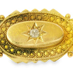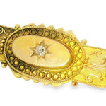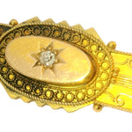 This Antique 15K Yellow Gold Diamond Brooch / Bar Pin is a stunning piece of vintage jewelry, featuring an old miner cut diamond at the center. The diamond, approximately 3 mm in diameter, adds a touch of classic elegance to the brooch. Crafted from 15K yellow gold, this piece exudes timeless beauty and sophistication, making it the perfect accessory for both formal and casual occasions. Measuring 1 & 5/8 inches long by just over 1/2 inch wide, this brooch is both delicate and eye-catching. Weighing 4.9 grams, it offers a luxurious feel while remaining lightweight for comfortable wear.