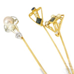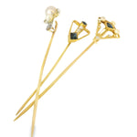 Victorian 14K Yellow White Gold Sapphire Diamond Seed Pearl Pin Set. This gorgeous set features 3 Victorian pins with diamonds, seed pearls and natural sapphires. The pins measure 2.75, 2.5...
