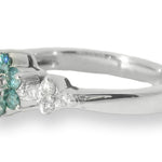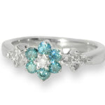 This stunning 14K white gold floral ring showcases an elegant and unique design, featuring a vibrant mix of blue and white diamonds arranged in a delicate floral pattern. With 6 brilliant round blue diamonds and 9 brilliant round white diamonds, this ring offers a dazzling sparkle and sophisticated charm.