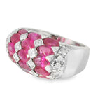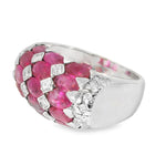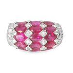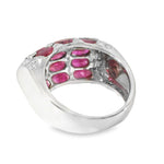 14K white gold ruby and diamond ring. This gorgeous piece features 15 natural oval rubies weighing 4.5 carats and 22 brilliant round diamonds, totaling .31 of a carat. The top...