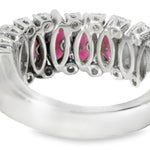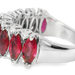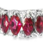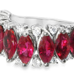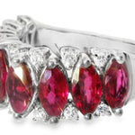 Add a pop of color and elegance to your collection with this 18K White Gold Ruby Diamond Wedding Band. Featuring 9 stunning natural marquise-cut rubies, each measuring 3 mm wide by 7 mm long, and 16 brilliant round white diamonds totaling 0.33 carats, this ring combines vibrant rubies with sparkling diamonds to create a timeless design. With a total ruby weight of 4.25 carats, this piece is perfect for celebrating love and commitment.