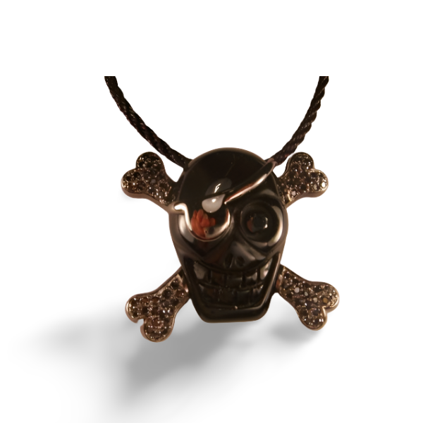 Sterling silver carved onyx skull and crossbones pendant. This great piece features 69 rhinestones. The pendant measures 1 and 1/4 inches long by 1 and 5/8 inches wide. It weighs 12.8 grams. The cord is not included.
