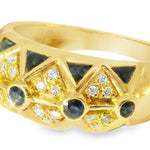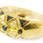 Crafted with precision, this size 7.5 ring offers a sophisticated and luxurious presence. With a weight of 6.2 grams, the ring combines solid 18K yellow gold with exquisite gemstones, making it a standout addition to any fine jewelry collection. Whether worn as a statement piece or paired with other bands, this designer ring will elevate any occasion.