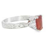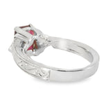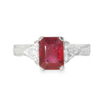This antique 14K white gold 3-stone ring radiates timeless elegance and sophistication. At its heart is a stunning emerald-cut ruby weighing 1.92 carats, showcasing vibrant red hues that captivate the eye. Flanking the ruby are two exquisite trillion-cut diamonds, totaling 0.62 carats, adding brilliance and contrast to this breathtaking design.