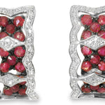 These exquisite 14K pink rose gold earrings are designed in a flower-inspired huggie style, featuring 104 single cut diamonds totaling .25 carats and numerous vibrant red rubies with a total weight of 1.21 carats. The diamonds add a sparkling contrast to the rich ruby hue, creating a stunning combination of elegance and color. Each earring measures 5/8 inch long by 5/16 inch wide, making them the perfect size for everyday wear or special occasions. The pair weighs 4.6 grams.