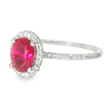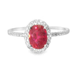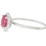This 14K White Gold Solitaire Ruby Diamond Cocktail Ring is an elegant and timeless piece. It features one natural oval ruby, weighing almost one carat, surrounded by numerous brilliant round diamonds, totaling 0.25 carats. The ring weighs 2 grams and is a size 7.25, with sizing available upon request for an additional charge.
