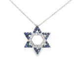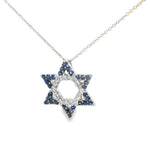This stunning Star of David pendant is a beautiful blend of tradition and elegance. Crafted from 14k white gold, it features intricate detailing vibrant sapphires and brilliant round diamonds that catch the light beautifully. Perfect for both everyday wear and special occasions, this pendant is a meaningful piece that adds a touch of sophistication to any outfit.