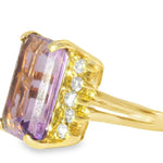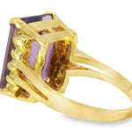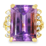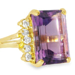 This antique 14K yellow gold diamond and amethyst statement ring is a captivating blend of elegance and bold design. The centerpiece is a stunning emerald-cut amethyst that radiates rich, vibrant purple hues, framed by 10 brilliant round diamonds totaling 0.30 carats. The diamonds add a touch of sparkle and sophistication, perfectly complementing the warmth of the yellow gold setting.