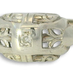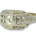 The top of the ring measures 1/2 inch wide, creating a subtle yet striking presence on the finger. At 1.7 grams, this lightweight ring offers comfortable wear for any occasion. The ring is size 6.5, with sizing options available upon request.